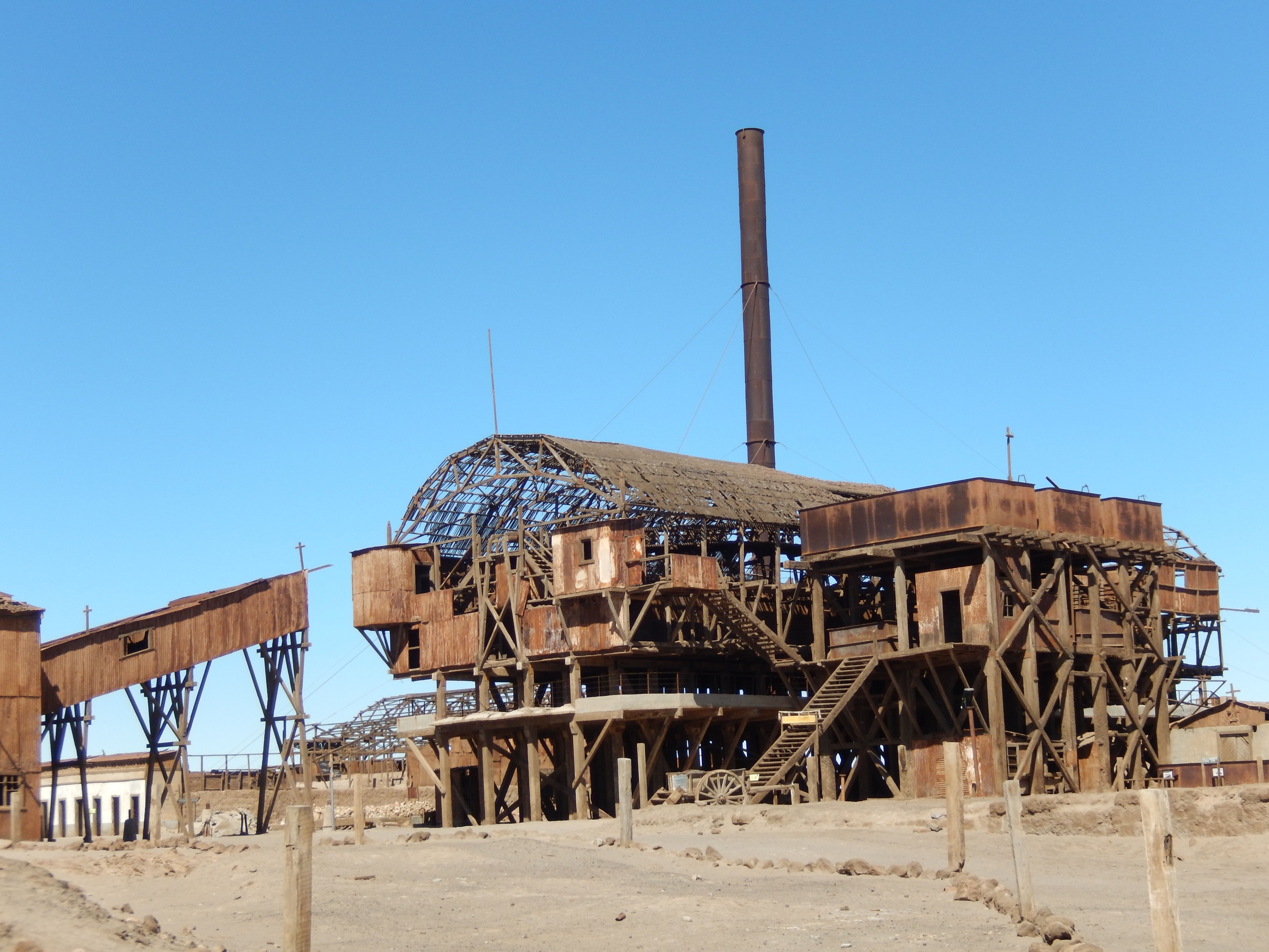 This ghost town, Santa Laura, is one of the remnants of a largely-forgotten industry that once made the Atacama Desert one of the most valuable places in the world. In the nineteenth century, the vast saltpetre (potassium nitrate) deposits in the region – then part of Peru and Bolivia – were heavily in demand for use as fertiliser and gunpowder in Europe and North America. A booming industry developed, with rapacious nitrate barons – many of them British – using the hefty profits to build opulent mansions in cities like Iquique. In 1878 the War of the Pacific broke out between Chile, and Peru and Bolivia: five years later, Chile emerged victorious, having seized all of the nitrate territories.